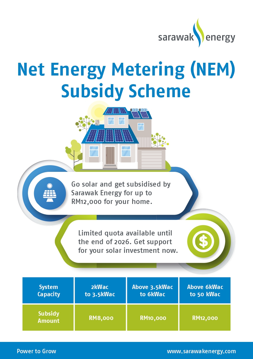 Net Energy Metering (NEM) scheme is a billing mechanism that credits direct Solar Photovoltaic (PV) system owners for the electricity they add to the grid. For example, if a residential consumer has a PV system on the rooftop, it may generate more electricity than the home uses during daylight hours. Rolling out of NEM scheme in Sarawak is to promote the use of renewable energy and the conservation of non-renewable energy at the consumer level.