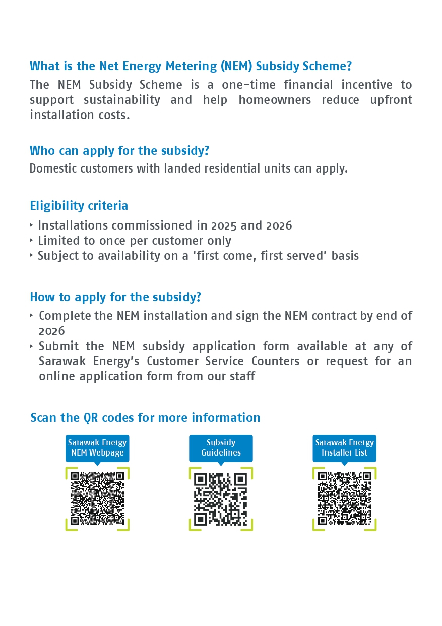 - Open to all tariff categories where applicants are connected to the Sarawak Energy Grid System.