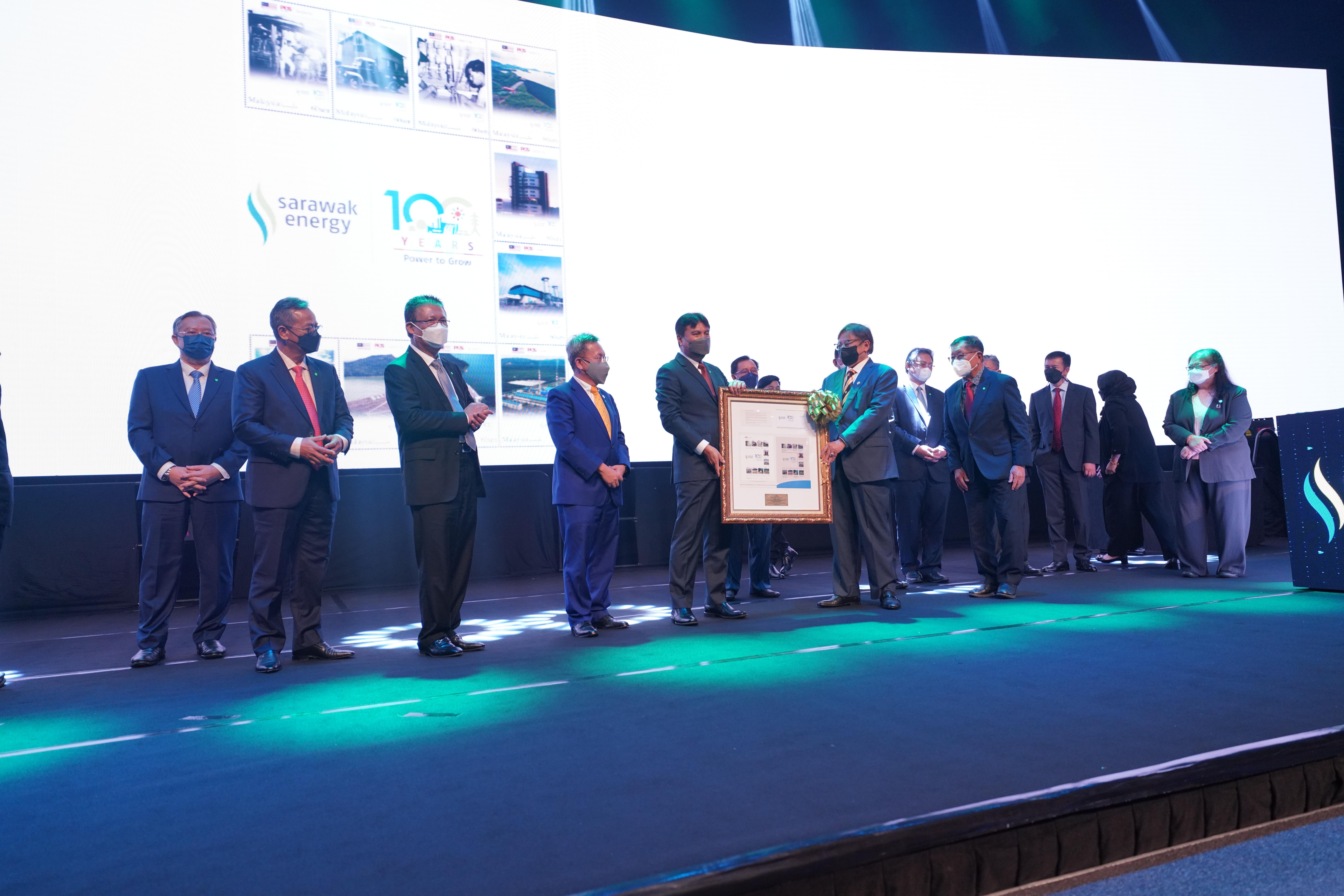 Sarawak Energy Group Chief Executive Officer Datu Hj Sharbini Suhaili presented Sarawak Chief Minister Datuk Patinggi Tan Sri (Dr) Abang Haji Abdul Rahman Zohari Tun Datuk Abang Haji Openg a framed up Sarawak Energy 100 Years commemorative stamps as others look on.