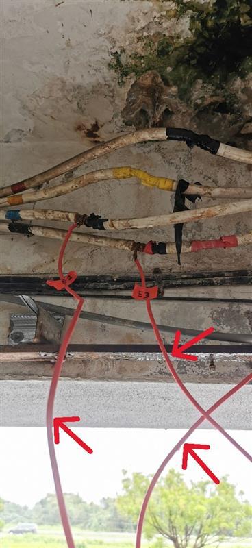 Direct tapping cables (red arrow) connected to the incoming mains supply.